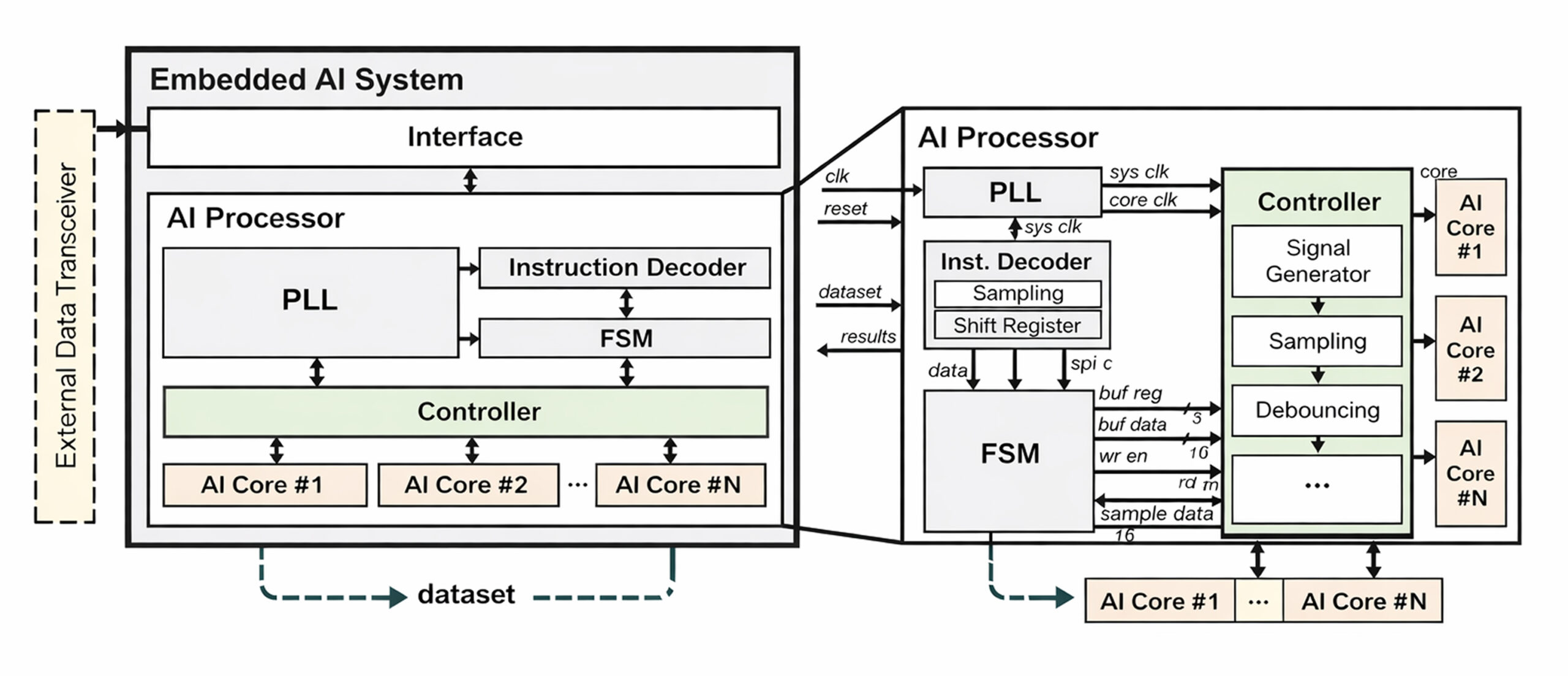This diagram illustrates how processing units, AI cores, interface controllers, and signal conditioning work together in an embedded learning system.