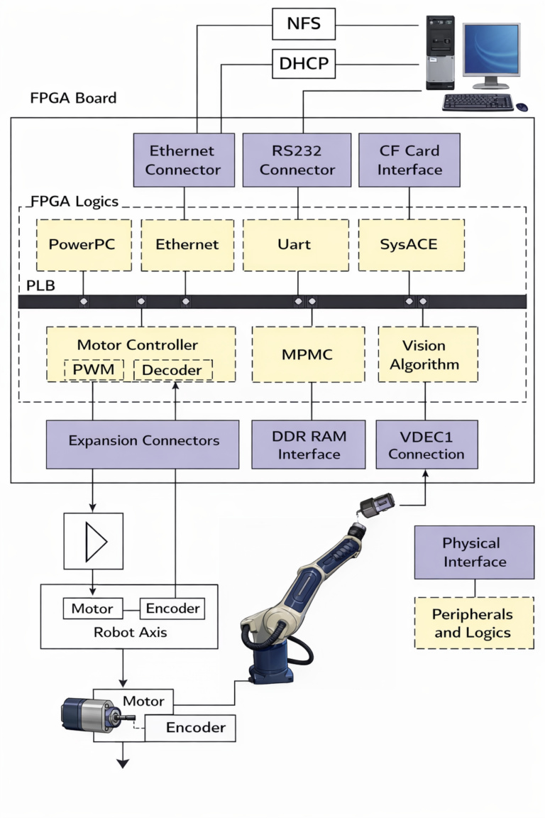 To better understand how embedded systems function inside next-generation industrial robots, it helps to look beyond the mechanical components and see the electronics and computing backbone that drives them. The graphic below illustrates a real-world embedded control architecture, showing how processors, sensor interfaces, power circuits, and actuators work together to enable precise robotic motion and autonomous decision-making.