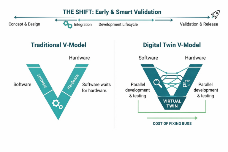 - Digital Twin V-Model: By using a Virtual Twin, engineering teams can perform parallel development and testing. This “Shift-Left” approach ensures that the cost of fixing bugs remains low by catching defects in the virtual stage rather than in late-stage hardware.